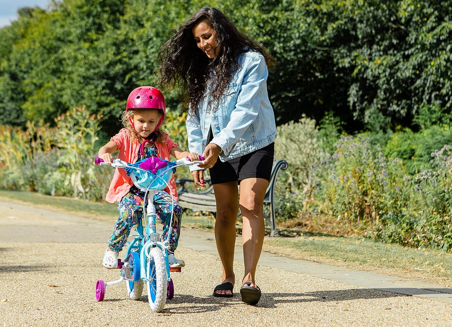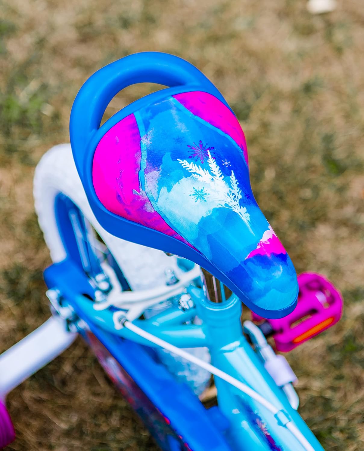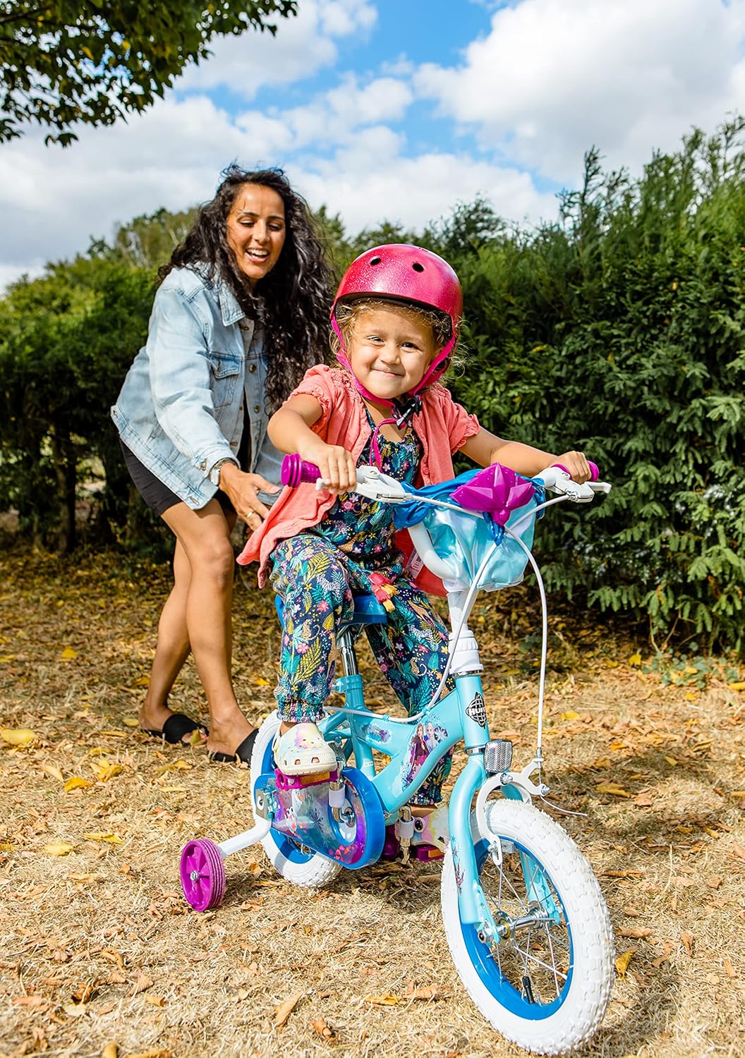 The official Disney Frozen 12 inch girls bike is the ideal way for your little one to start their cycling journey alongside Anna & Elsa with this stunning bike. Finished in signature blues, deep purple colours and graphics, plus the unique Frozen handlebar carry pouch, this is the ideal first bike for children learning to ride. This 12 inch kids bike is suitable for children 3-5years old or 98-112cm in height. The comfortable seat can be raised as your child grows. This Official Disney Frozen bike features Huffy's Quick Connect assembly system. Arriving 85% assembled, the finishing steps are quick and simple. Click the handlebars in and secure by hand tightening the collar. Flip our the pedals, no screwing in required! If using stabilisers, they simply click in quickly and can be easily removed once skills have progressed. Finally inflate the tyres to your desired pressure, check the brakes, and off you go!